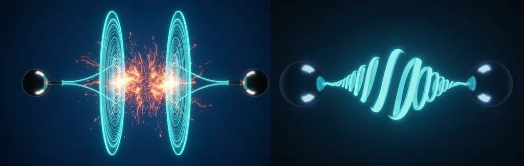 The flows do not collide but merge; their velocities add up. The ether in the gap begins to flow faster than outside. According to Bernoulli’s principle, a sharp increase in velocity causes a drop in pressure between the particles. A rarefaction zone arises. The external, undisturbed ether pressure from all sides begins to squeeze these two vortices toward each other. This is Coulomb attraction.